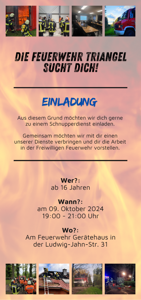 Gemeinsam verbringen wir mit dir den regulären Dienst zum Thema "taktische Ventilation" und weitere kleine Themen im Bereich der Brandbekämpfung. Zusätzlich zeigen dir alles Rund um das Thema Feuerwehr. Wenn du also zwischen 16 und 67 Jahre alt bist, Interesse an der Mitarbeit in der Feuerwehr hast und du in Triangel wohnst, dann halte dir den