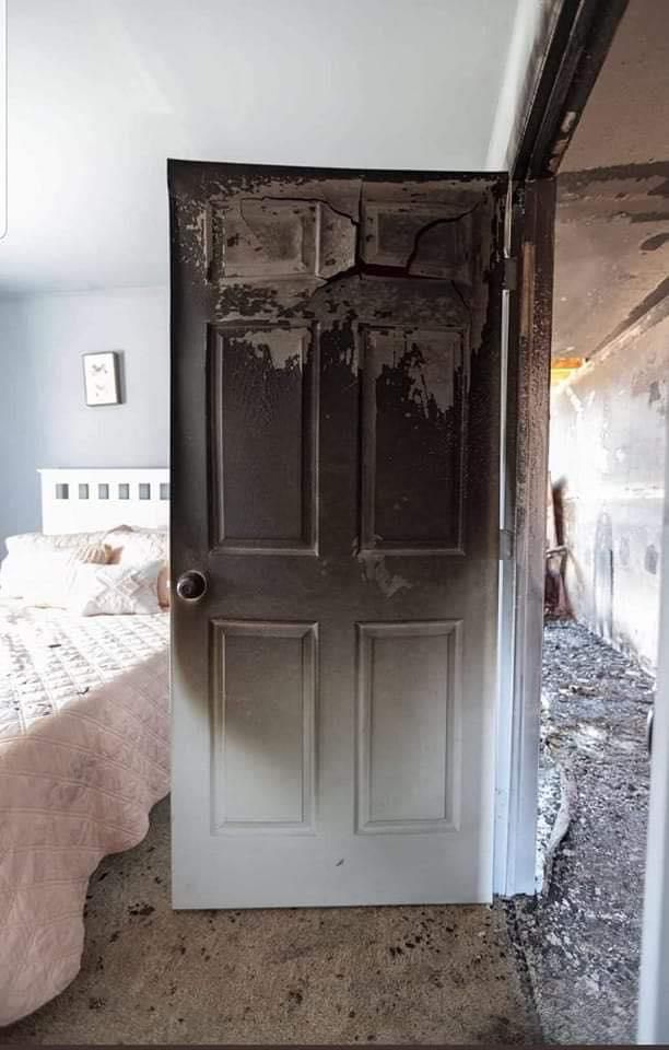 Zu sehen ist ein Brandgeschädigter Raum (Flur o.ä.) und ein noch weitestgehend „weißer Raum“. Dieser war bis zum Ende der Löscharbeiten mit einer herkömmlichen Zimmertüre verschlossen.