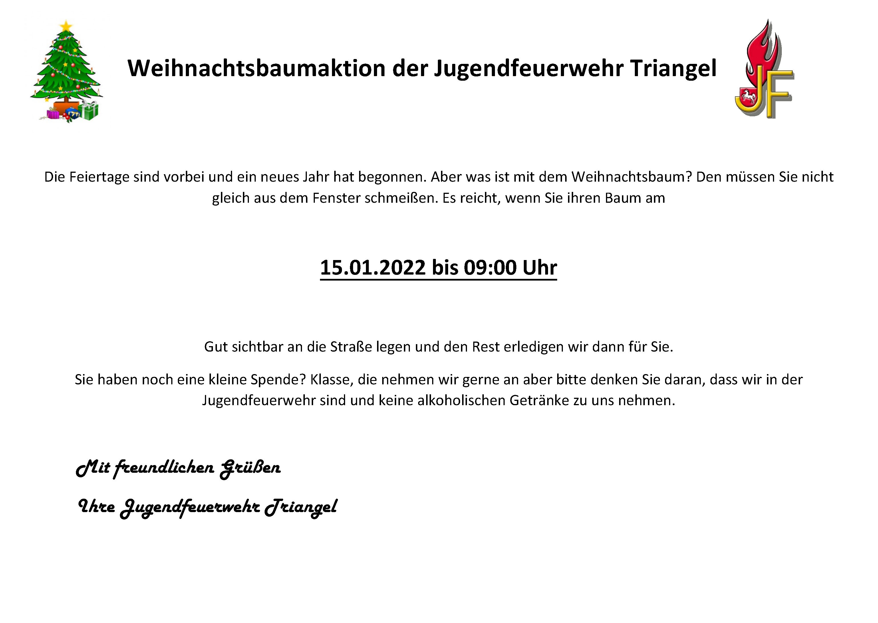 Einsammeln der Weihnachstbäume Written on 06 January 2022. Posted in Jugendfeuerwehr Die Feiertage sind vorbei und das neue Jahr hat begonnen. Aber was ist mit dem Weihnachtsbaum? Viewed: 123870 Print Email