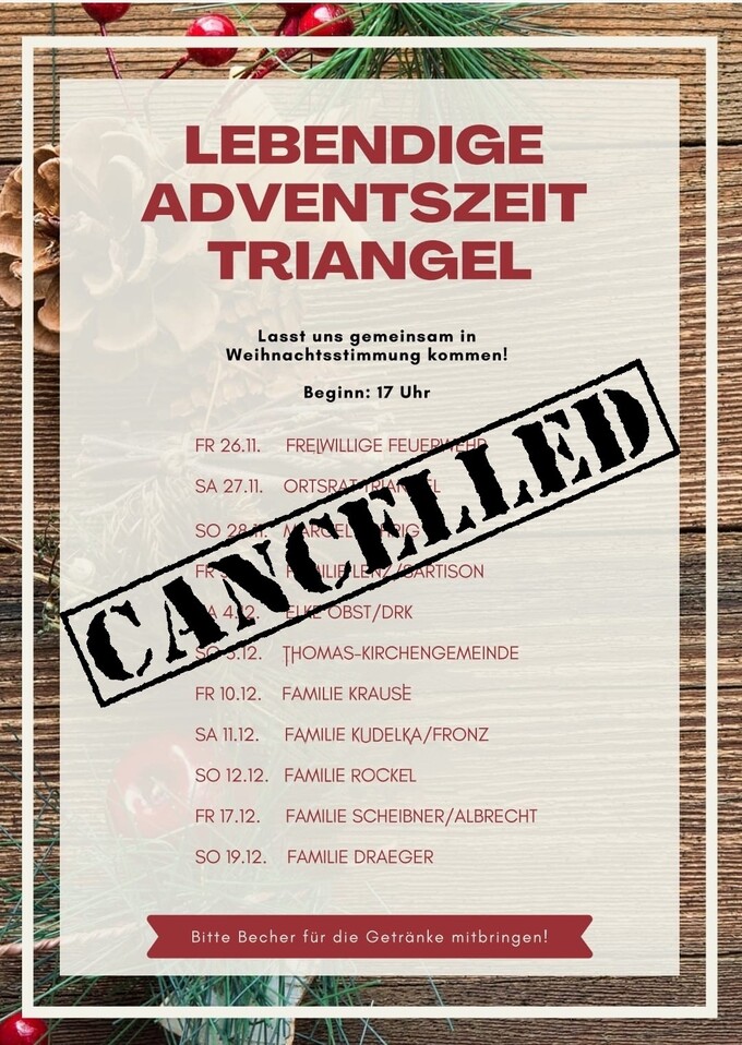 Die derzeit geltenden Bestimmungen des Landes Niedersachsen machen es uns nicht gerade einfach dieses neue Event für die Triangeler durchzuführen. Außerdem weiß keiner genau was noch kommt; angesichts der im Moment steigenden Infektionszahlen. Daher mussten auch wir für dieses Jahr die „Lebendige Adventszeit“ leider absagen.